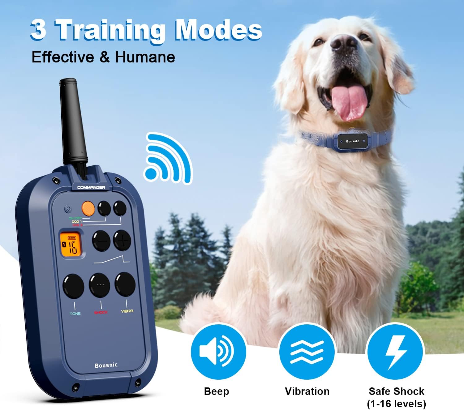- Three Training Modes with Adjustable 1-16 Safe Shock Levels:Bousnic dog shock collar features 2 channels and 3 training modes, allowing you to educate your dog effectively and safely by using either beep, vibration, or safe shock modes.