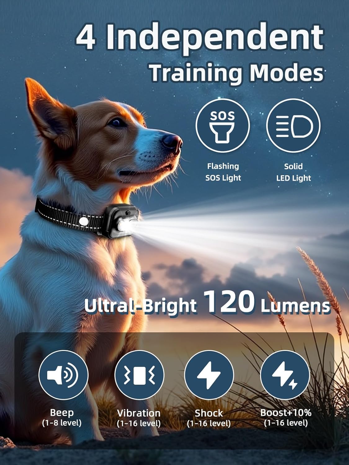 - 【Ultral-Bright 120 Lumens LED/SOS Light】The dog training collar features a ultra-bright LED light for night-time visibility and an SOS mode for emergencies. Perfect for outdoor adventures - keeps your dog seen and safe in low-light conditions.